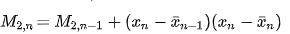 In conclusione, l’algoritmo di Welford permette di calcolare il numeratore della varianza di n valori (M2,n) sommando al numeratore della varianza relativo ai primi n termini (M2,n-1) il prodotto tra lo scarto presente tra l’n-esimo valore della lista e la media dei primi n-1 numeri e lo scarto tra l’n-esimo valore della lista e la media totale