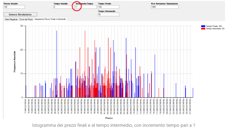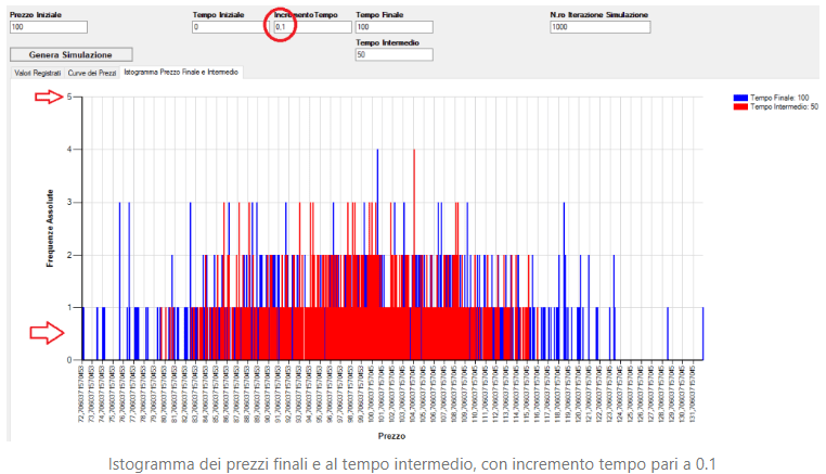 Notiamo come per Δt → 0 (si nota dalle distribuzioni di frequenza sottostanti) le frequenze assolute tendono a diminuire sempre più per i valori vicino a prezzo iniziale, tanto da avere molti valori dei prezzi, sia per il tempo finale che per il tempo intermedio, con frequenza assoluta pari a 1. Questo indica che un incremento di tempo sempre minore per questo tipo di variazione dei prezzi porta ad avere una maggiore incertezza sul valore esatto del prezzo ad un determinato tempo.