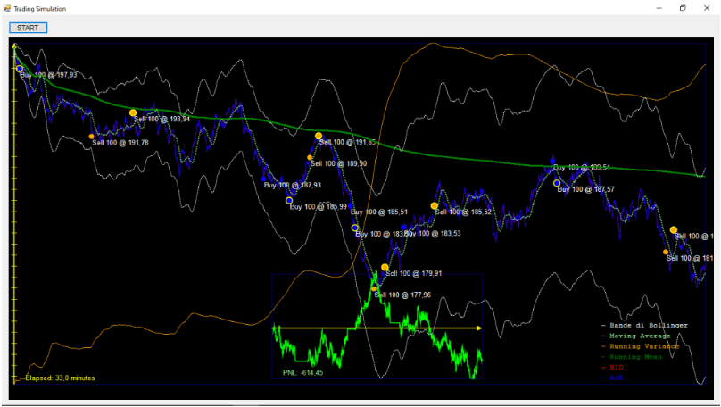 - TradingSimulation: L’esercizio 4 presenta la seguente struttura: processo aleatorio + ordini e calcolo PNL. Viene poi completato aggiungendo i 4 indicatori quantitativi Running Mean, Moving Averages, Moving STD, Bollinger Bands.Nell’applicazione caricata si ha una rappresentazione di una curvadei prezzi (BID e ASK) con la generazione di ordini Sell o Buy. Si ha quindi il calcolo del PNL e una rappresentazione grafica.Si hanno inoltre i 4 indicatori quantitativi richiesti: Running Mean, Moving Averages, Moving STD, Bollinger Bands.