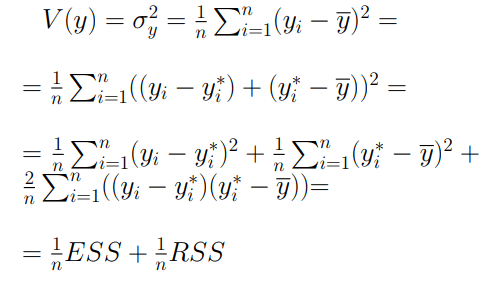 Come già sappiamo, la varianza di un data set di unità ci permette di capire quanto questi ultimi si discostano dalla loro media. Tuttavia, nello studio della regressione lineare è possibile scomporre la varianza in modo tale da tener conto non soltanto dei valori y_i ma anche dei corrispettivi y*_i. Cominciamo dalla formula generica della varianza