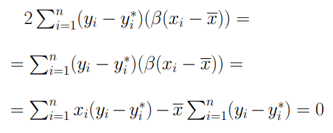 dove ESS rappresenta il numeratore della varianza degli errori (quanto i valori y_i si discostano da y*_i) mentre RSS rappresenta il numeratore della varianza di regressione (la parte della varianza totale spiegata dalla retta di regressione). Se osserviamo con maggiore attenzione la scomposizione della varianza possiamo notare come il doppio prodotto presente nel penultimo passaggio sia stato eliminato: ciò si dimostra come segue. Per prima cosa ricordiamo le relazioni che ci hanno permesso di determinare l’equazione della retta di regressione