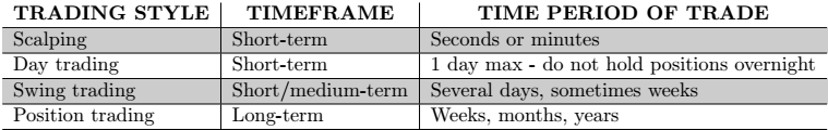 Esistono quattro tipi principali di strategie di trading: scalping, day trading, swing trading e position trading. Differenti stili di trading dipendono dal periodo e dalla durata del periodo di apertura.